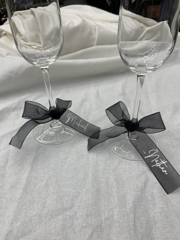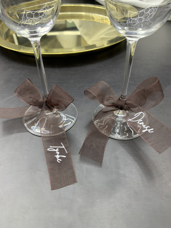 Hoe tof zijn deze naam 'kaartjes' Voeg een romantische en stijvolle touch toe aan je tafelschikking. Maak een mooie strik om de wijn glazen met de namen van alle gasten, zo weten ze precies waar ze moeten gaan zitten maar heb je niet de standaard kaartjes op de borden staan. En de gasten hebben meteen een leuk aandenken/bedankje die ze mee naar huis kunnen nemen.