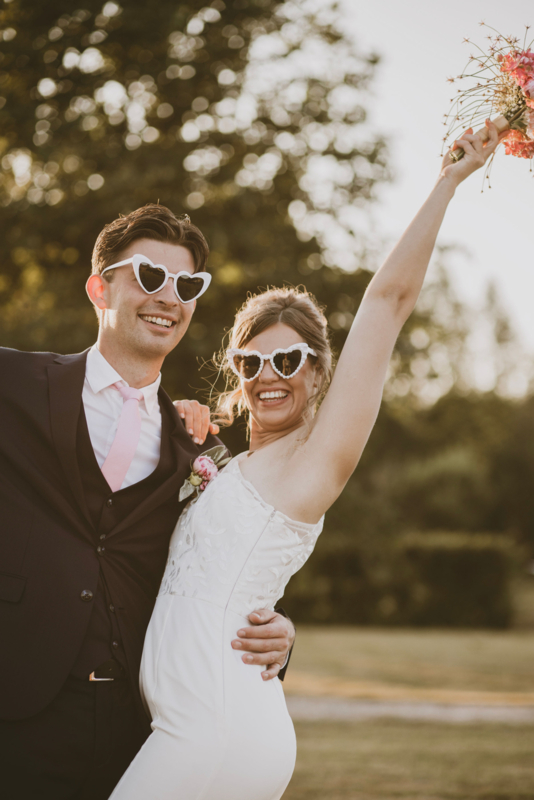 wit met donkere glazen, voor als het zonnetje schijnt, om op te zetten tijdens jullie feestavond, of gewoon voor de leuk op jullie honeymoon!